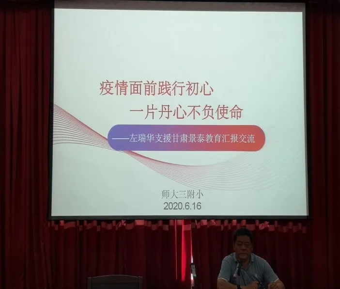 6月9日,左瑞华老师光荣地完成了东西部扶贫协作交流任务,胜利回归我校。带着援教时的所思所想所得,在6月17日我校全体教师会上做了“疫情面前践行初心,一片丹心不负使命”支援甘肃景泰教育汇报交流。在汇报中,左老师就援教活动的前期准备、援教地区的教育教学情况、援教期间的所见所闻、援教归来的所想所感等方面,向大家一一分享交流,并坦言在此次援教活动中,感受最深的是对教育的再认识,对东西部教育的再思考。今后会对教育教学做深度研究,将一直为西部地区的孩子贡献一份力量。汇报最后,左老师引用了一位在景泰工作的西青干部为援甘返津人员写的一首诗的其中一段作为结束,这首诗的名字是《送亲友离别景泰归津城》:
