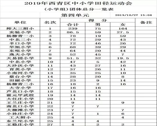 西青区全民运动会暨2019年西青区中小学田径运动会于10月13日、26日、27日在我校召开。经过三天的激烈角逐,我校的运动健儿们再创佳绩,以总分239分获得西青区小学组团体总分第一名!这也是我校取得的第十一个冠军,而且是十一连冠!