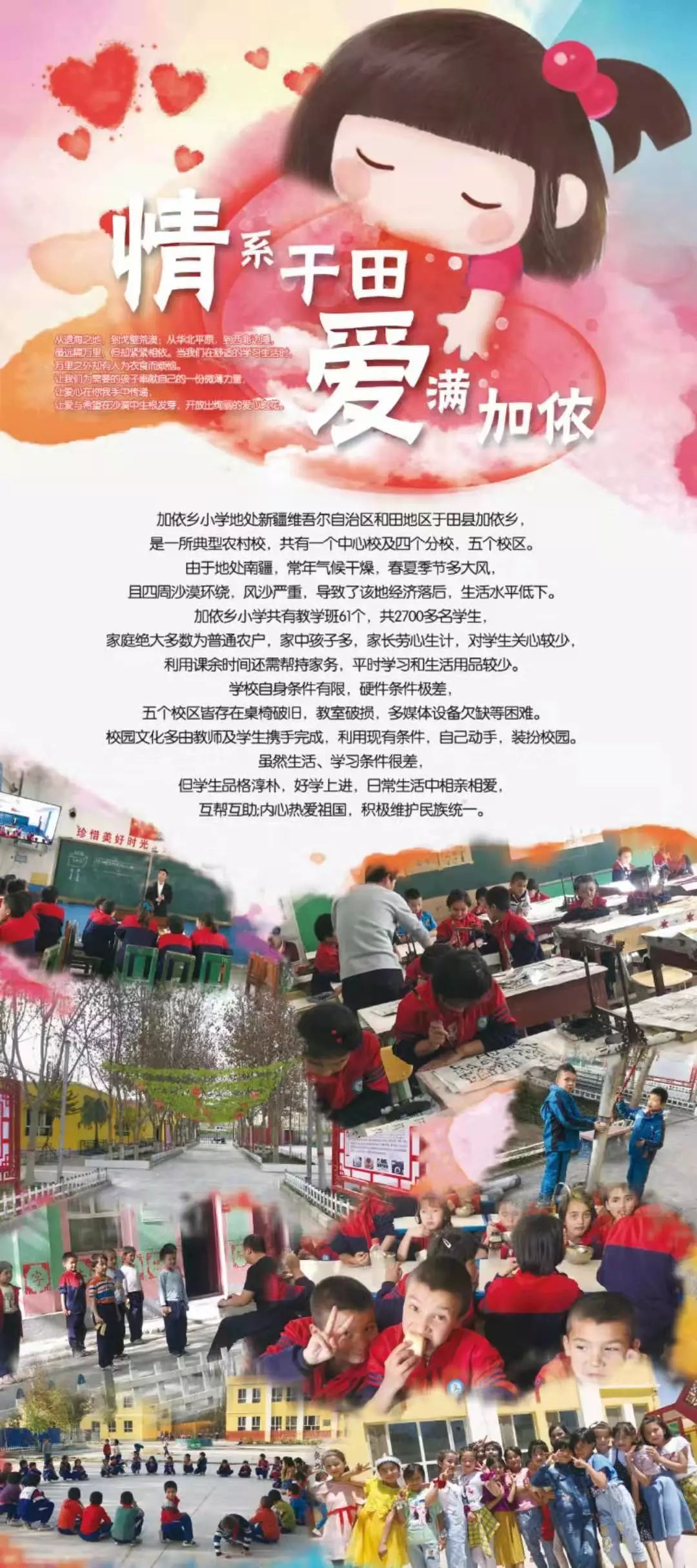 加依乡小学地处新疆维吾尔自治区和田地区于田县加依乡是一所典型农村校,共有一个中心校及四个分校,五个校区。由于地处南疆,常年气候干燥,春夏季节多大风目四周沙漠环绕,风沙严重,导致了该地经济落后,生活水平低下。加依乡小学共有教学班61个,共2700多名学生,家庭绝大多数为普通农户,家中孩子多,家长劳心生计,对学生关心较少,利用课余时间还需帮持家务,平时学习和生活用品较少。学校自身条件有限,硬件条件极差,五个校区皆存在桌椅破旧,教室破损,多媒体设备欠缺等困难。校园文化多由教师及学生携手完成,利用现有条件,自己动手,装扮校园。虽然生活、学习条件很差,日学生品格淳朴,好学上进,日常生活中相亲相爱,互帮互助内心热爱祖国,积极维护民族统一。