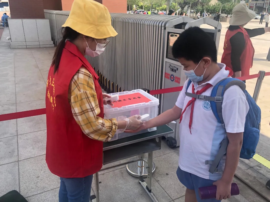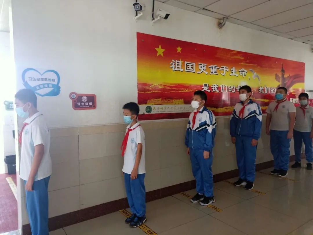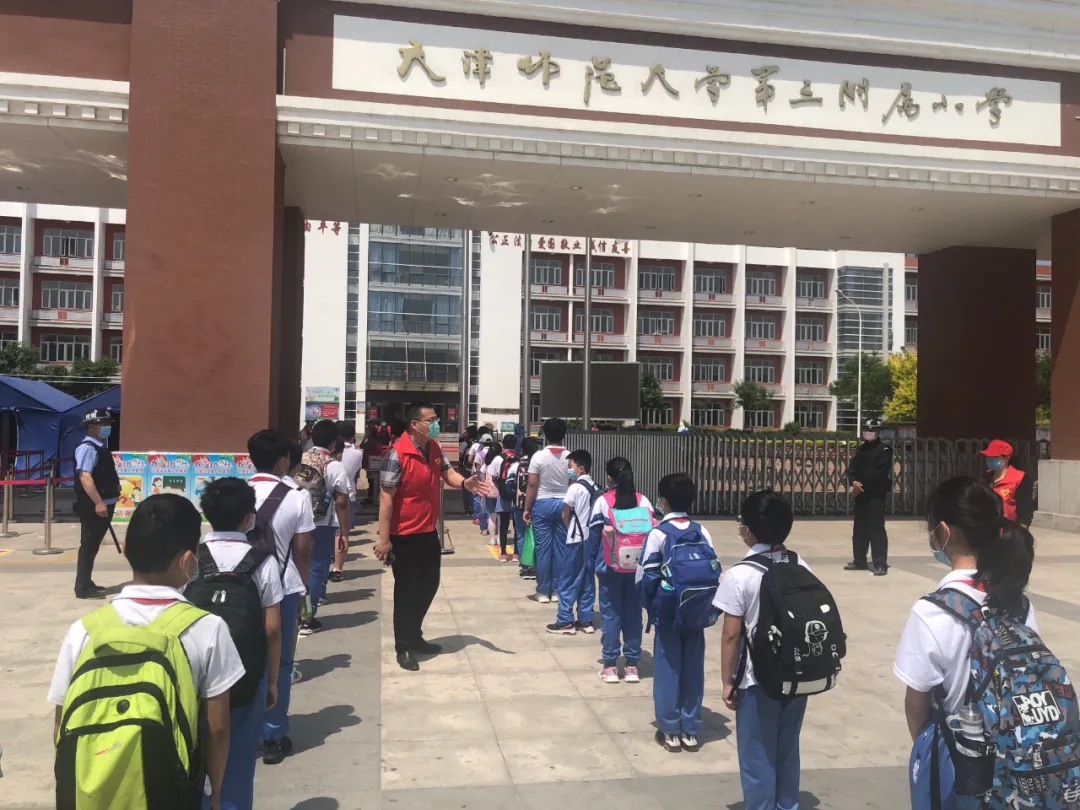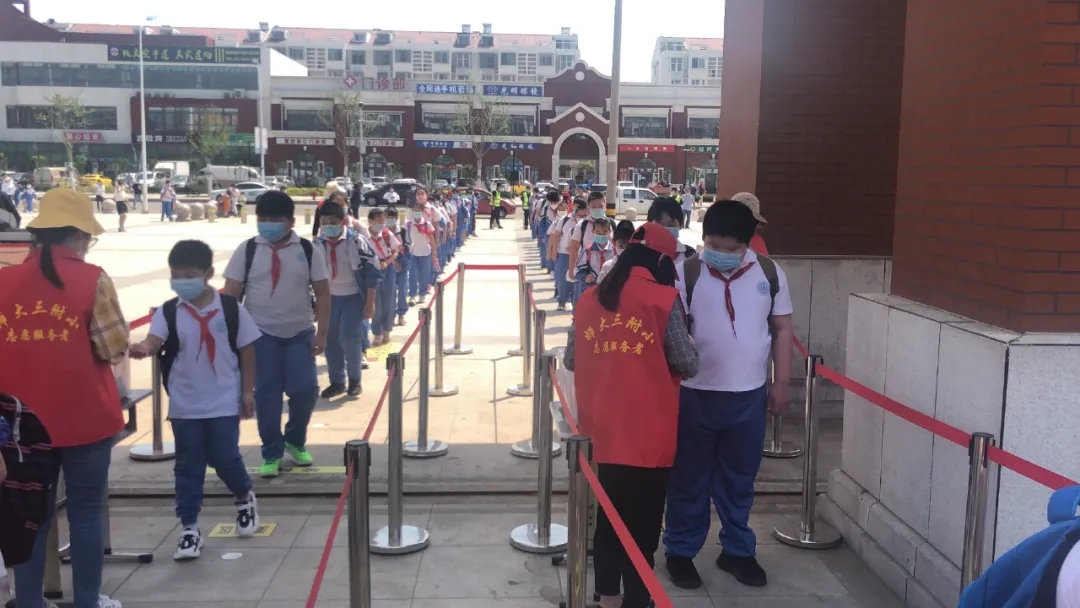 返校当天,校领导、全体执勤教师提前到达学校门口,各司其责,迎接孩子们的到来。学生们到达校门口,自觉站在等候点位按照规定通道排队入校。孩子们遵纪律、守规则,佩戴口罩、保持间距排队、测温、手消、规定路线入校,所有流程井然有序,充分展示了师大三附小学子的规范意识。