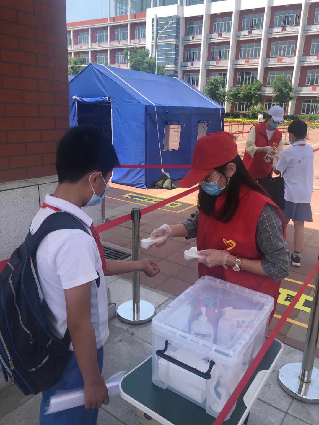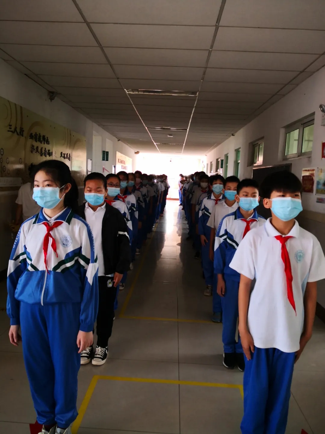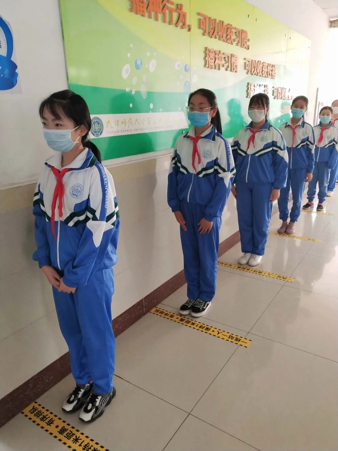 返校当天,校领导、全体执勤教师提前到达学校门口,各司其责,迎接孩子们的到来。学生们到达校门口,自觉站在等候点位按照规定通道排队入校。孩子们遵纪律、守规则,佩戴口罩、保持间距排队、测温、手消、规定路线入校,所有流程井然有序,充分展示了师大三附小学子的规范意识。