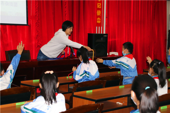 刘老师从简单魔术理论知识、教学魔术《巧连绳环》等多个方面为同学们进行了详尽的讲解。简单的舞台、形象的道具、引人入胜的情节,深深地吸引了学生们的注意力。
