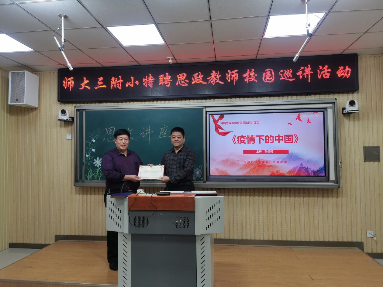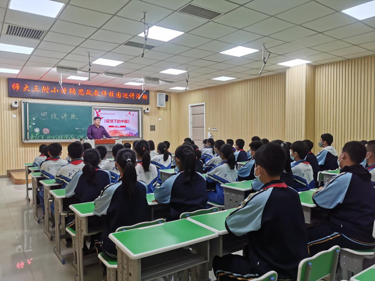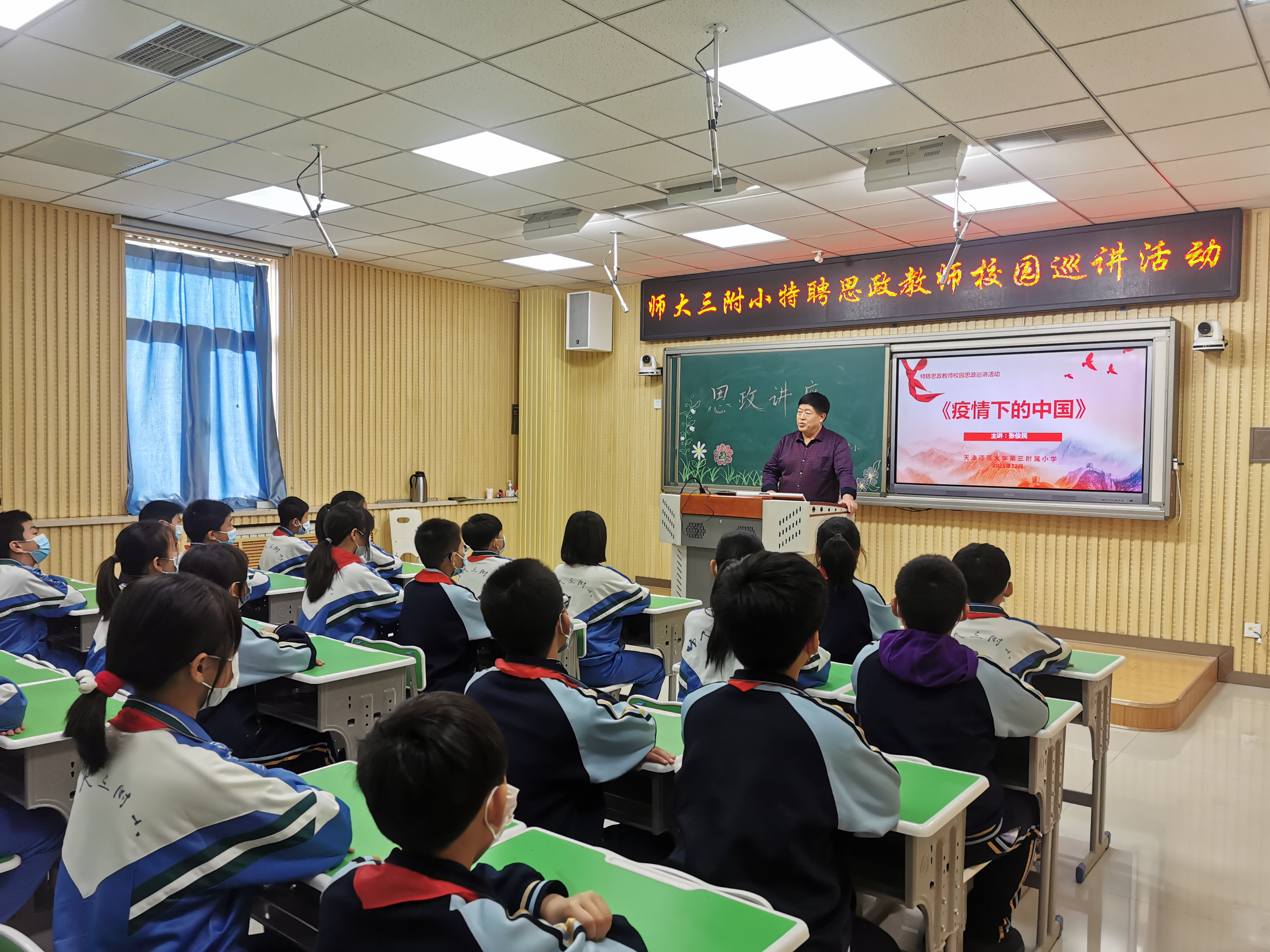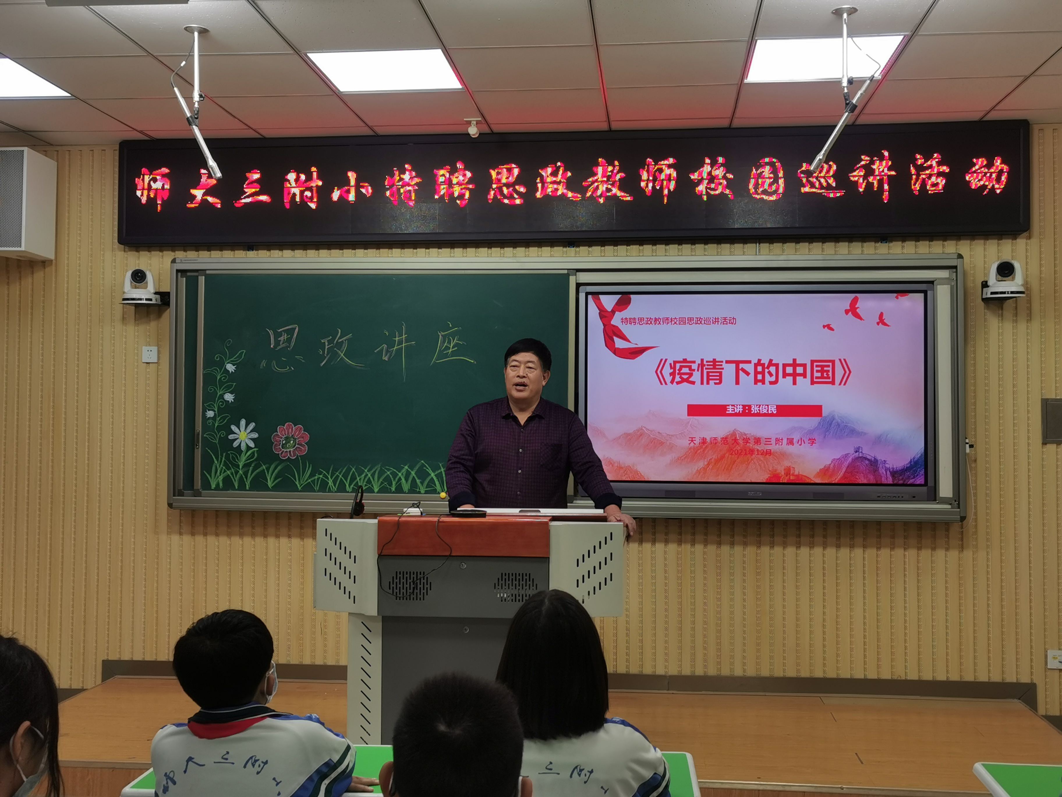 为进一步全面贯彻落实党的教育方针和立德树人根本任务,全力以赴办好学校特色思政课,本着“种树必培其根,种德必养其心”的理念,引领学生扣好人生第一颗扣子。2021年12月13日,我校荣幸地邀请到思政特聘教师——师大三附小退休校长张俊民同志,为师生带来主题为《疫情下的中国》校园巡讲活动。